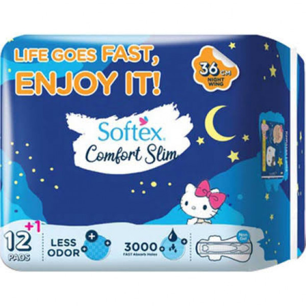 Softex Comfort Slim Hello Kitty Night 36cm merupakan salah satu varian pembalut dari Softex seri Hello Kitty yang dirancang nyaman dipakai dan dapat diandalkan di hari-hari yang banyak. Pembalut Softex Hello Kitty hadir dalam desain lebih panjang berukuran 36cm serta dilengkapi sayap yang membuat lebih nyaman tidur di saat banyak. Dengan inovasi lapisan Liquid Lock, Softex Comfort Slim Hello Kitty Night mampu menyerap dan mengunci cairan di tengah untuk mencegah bocor
