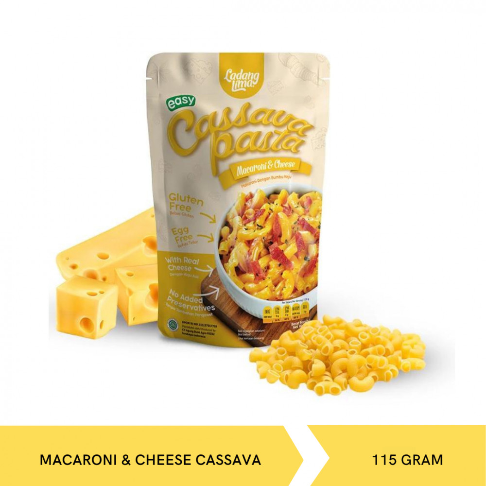 Varian pasta paling best seller yang nikmat & sehat. Terbuat dari tepung mocaf/singkong Ladang Lima, lengkap dengan bumbu keju asli dan bebas MSG.