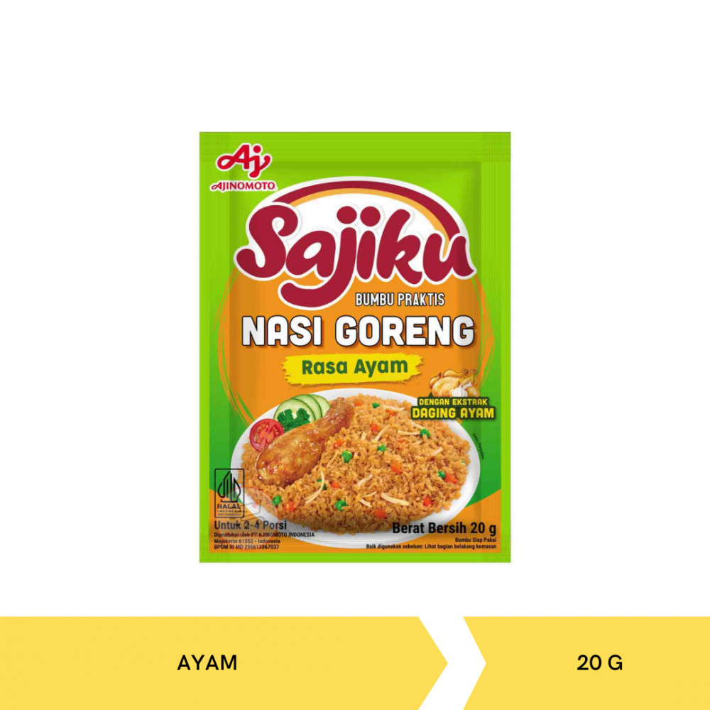 Sajiku Nasi Goreng - Ayam merupakan bumbu praktis khas Indonesia yang dikenal sejak lama dan diproduksi oleh PT Ajinomoto Indonesia, Mojokerto. Sajiku Nasi Goreng Rasa Ayam adalah bumbu praktis dan lengkap untuk membuat Nasi Goreng