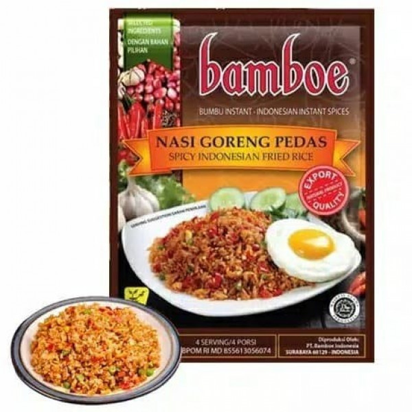 Bamboe Bumbu Nasi Goreng Pedas 40 Gr merupakan bumbu nasi goreng instan yang terkenal sejak tahun 1968.Bamboe Bumbu Nasi Goreng Pedas 40gr telah mendapatkan sertifikasi halal dari MUI, diproduksi menggunakan pilihan bahan-bahan natural yang fresh dan berkualitas, tanpa tambahan extract, essence, maupun pewarna buatan.Komposisi: bawang merah, cabai, bawang putih, garam, minyak nabati, tomat, bumbu udang.