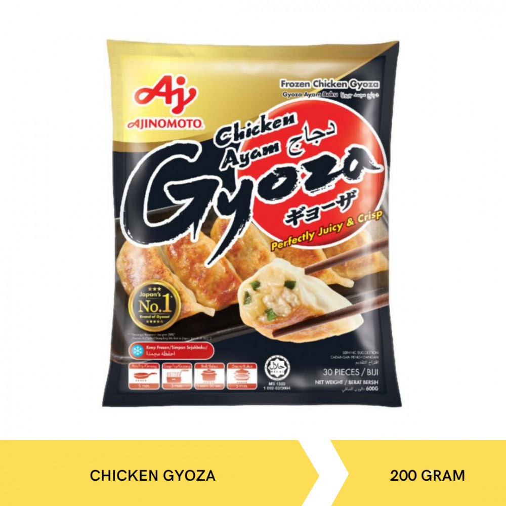 "AJINOMOTO" Gyoza adalah Gyoza bergaya Jepang yang autentik, terbuat dari perpaduan sempurna daging ayam ```````````````````````````````````````````````b g dan sayuran dengan kulit tipis yang memberikan rasa renyah dan juicy.