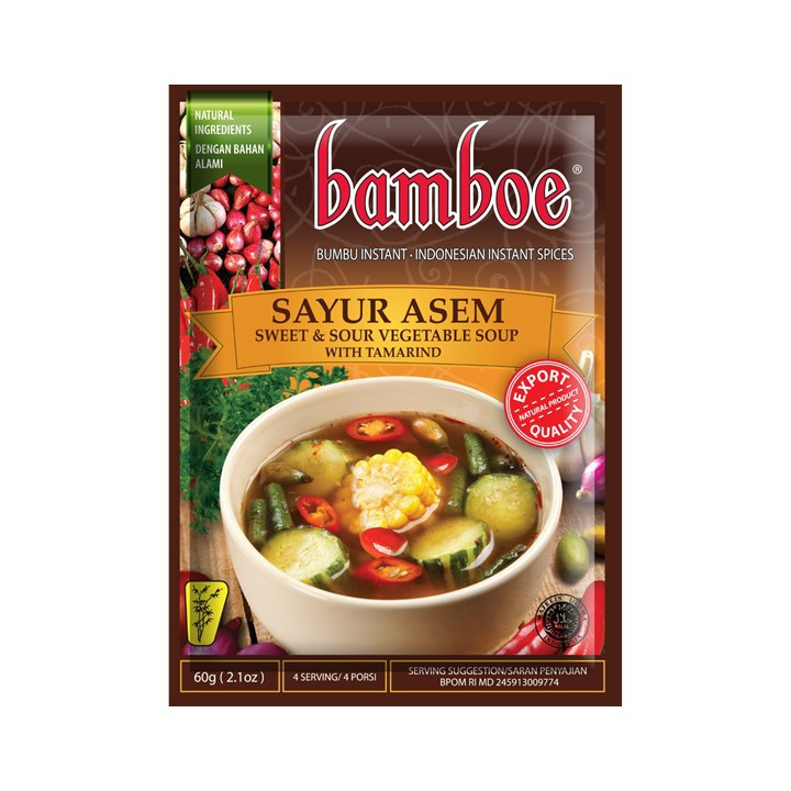 Bamboe Bumbu Sayur Asem 60gr merupakan bumbu sayur asem instan yang telah dikenal sejak tahun 1968. Diproduksi menggunakan pilihan bahan-bahan natural yang fresh dan berkualitas, tanpa tambahan extract, essence, maupun pewarna buatan. Kini hadir dalam kemasan yang praktis untuk mempermudah anda menyajikan hidangan spesial untuk keluarga.