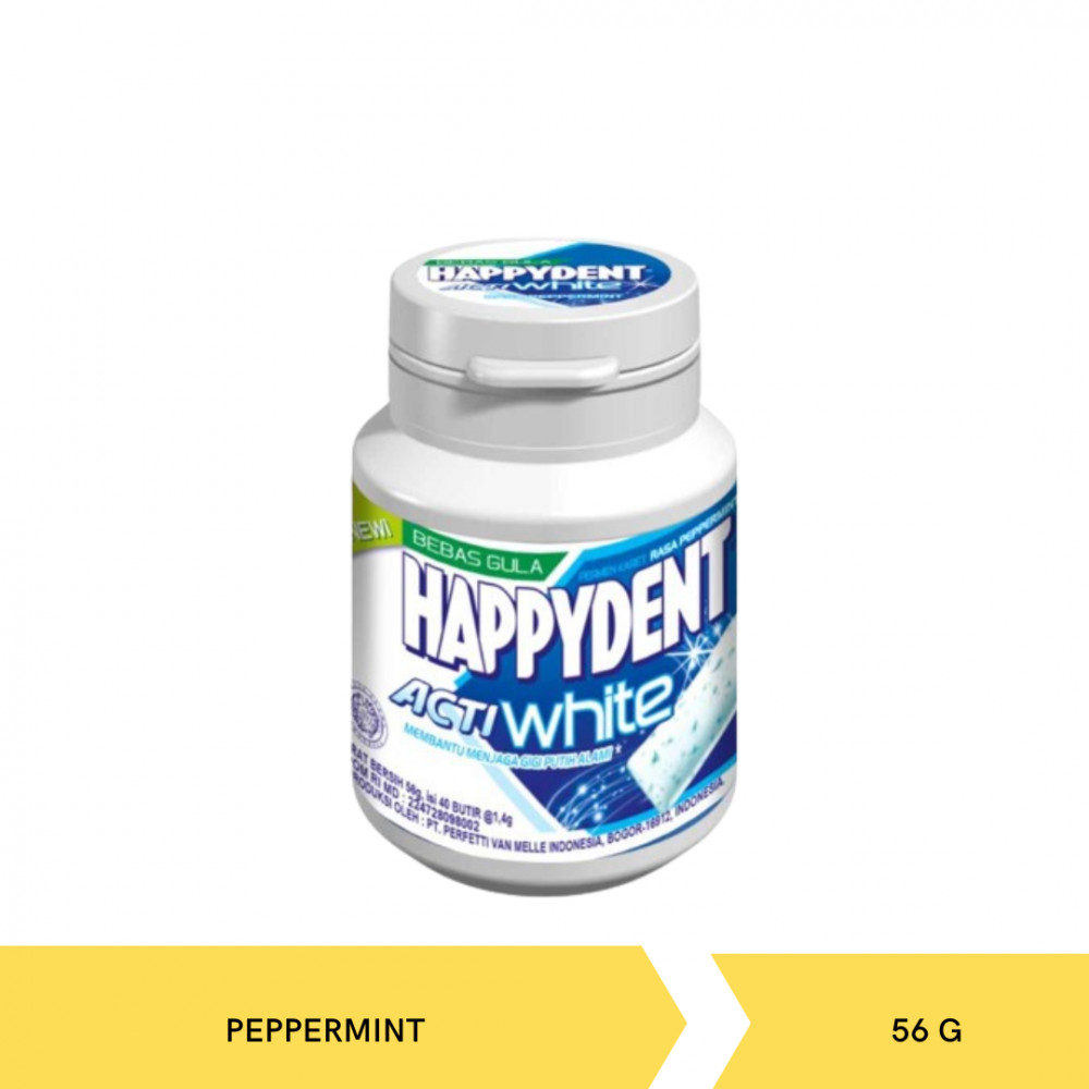 Happydent Acti White Sugar Free Bottle adalah permen karet bebas gula rasa pepperrmint yang memberikanmu sensasi segar dan membantu menjaga gigi putih alami. Permen karet Happydent Acti White Sugar Free Bottle terkemas di dalam botol dan berisi 40 butir.