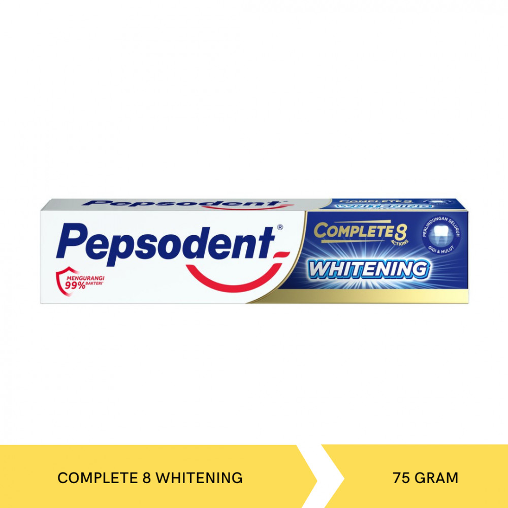 • Pasta Gigi Pepsodent Complete 8 Plus Whitening adalah pasta gigi pemutih / teeth whitening dengan perlite bahan efektif untuk menghilangkan noda. Gigi tampak lebih putih dalam 2 minggu