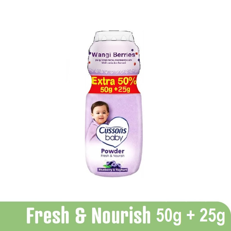 Cussons Baby Powder Fresh and Nourish merupakan bedak bayi yang telah diformulasikan secara khusus untuk menjaga kulit bayi tetap halus dengan wangi bunga yang lembut. Diperkaya dengan Blueberry Extract yang kaya vitamin A dan C untuk kulit sehat, dan Yoghurt dan Vitamin E untuk menjaga kelembaban dan kekenyalan kulit bayi Bunda dengan aroma wangi buah segar. Keunggulan Formula Lembut Dermatologically tested – lulus uji dokter kulit Tidak ada pewarna atau pengawet.