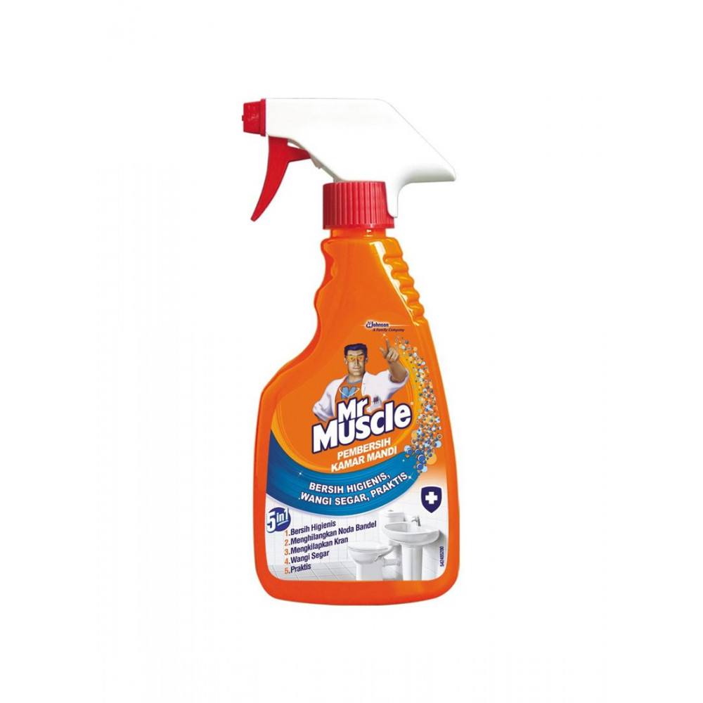 MR. MUSCLE PEMBERSIH KAMAR MANDI 5 IN 1 Adalah Pembersih Kamar Mandi Serbaguna yang sangat praktis, cukup semprotkan dan lap tanpa perlu dibilas. Membunuh 99% bakteri, Menghilangkan noda sabun membandel pada bath tub, dinding dan lantai kamar mandi, Memberikan wangi segar pada kamar mandi
