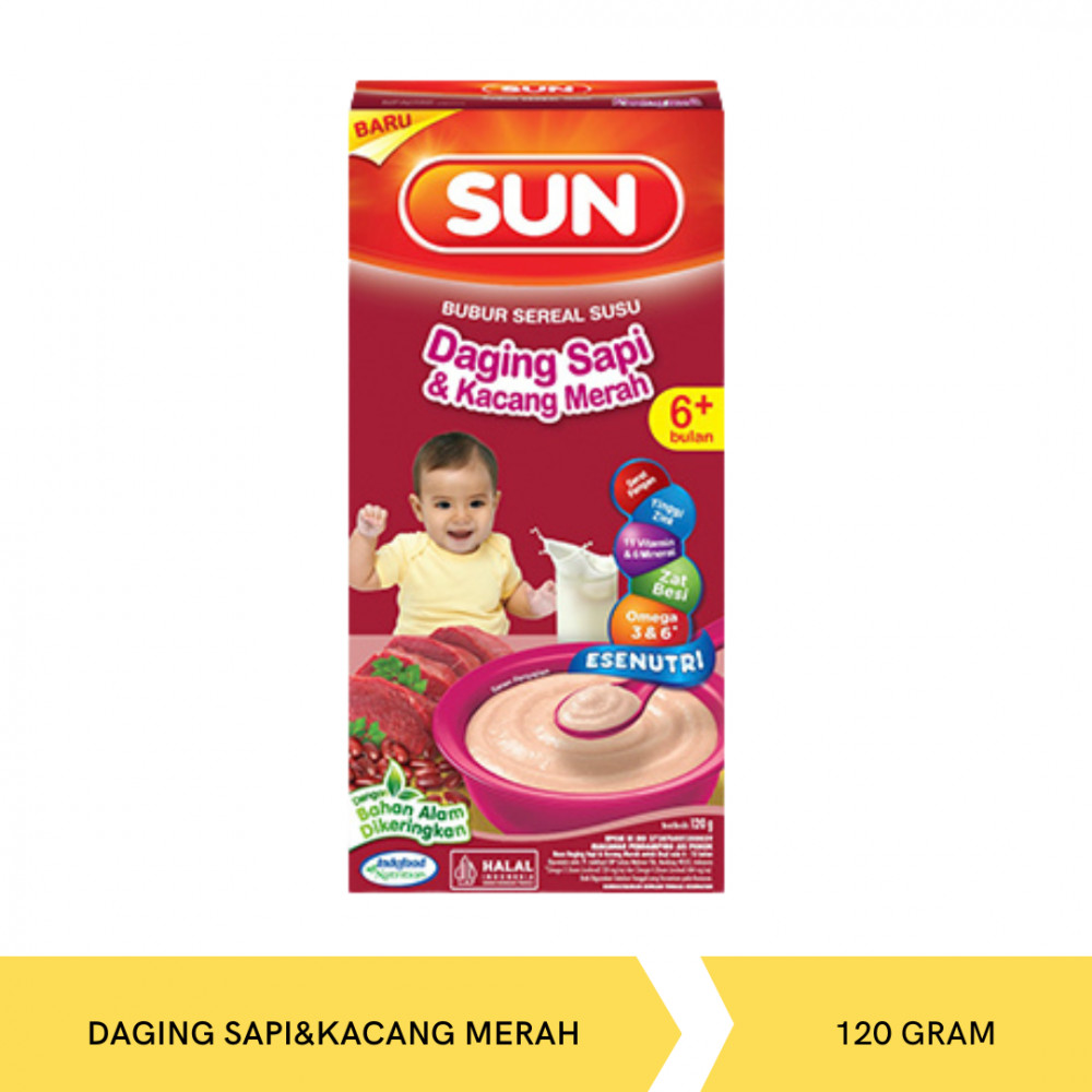 BARU, Bubur SUN Daging Sapi & Kacang Merah! Bubur sereal susu untuk bayi 6 bulan ke atas yang dibuat dengan bahan asli: daging sapi dan kacang merah pilihan, berlimpah nutrisinya dan tanpa bahan pengawet.