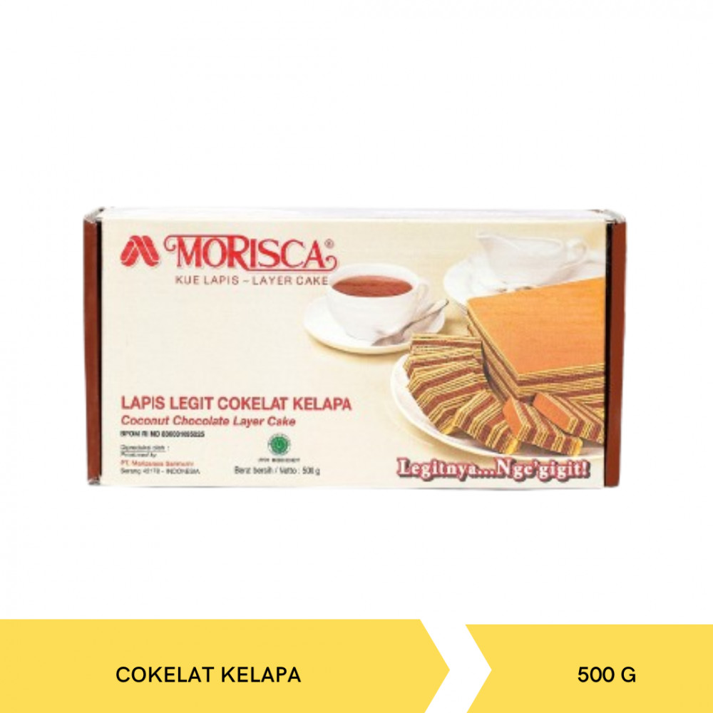 Morisca Kue lapis legit Coconut Chocolate ukuran 500 gr, Terbuat dari komposisi telur, gula, lemak susu anhidat, margarin, tepung terigu, susu kental manis, pengemulsi, pengembang makanan, dan tanpa pemanis buatan