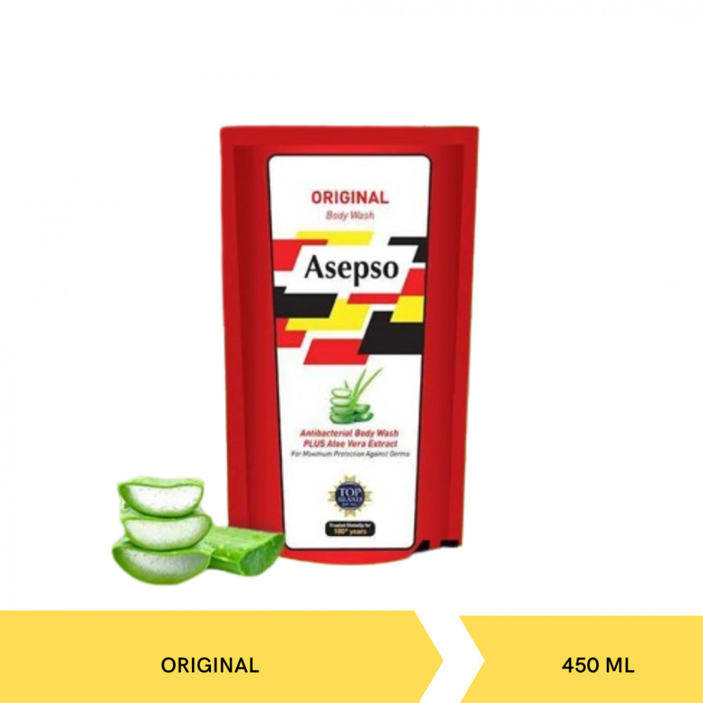 Asepso Body Wash Original mengandung zat antibakteri dan lidah buaya untuk membiarkan kulit Anda bersih dan halus setelah setiap cucian. Untuk hasil yang baik, gunakanlah Asepso Soap Original setiap hari. Dengan sabun Asepso, kulit anda menjadi tampak bersih, serta terlihat cerah dan segar sepanjang hari. Asepso yang siap membersihkan dan merawat kulit anda sepanjang hari.