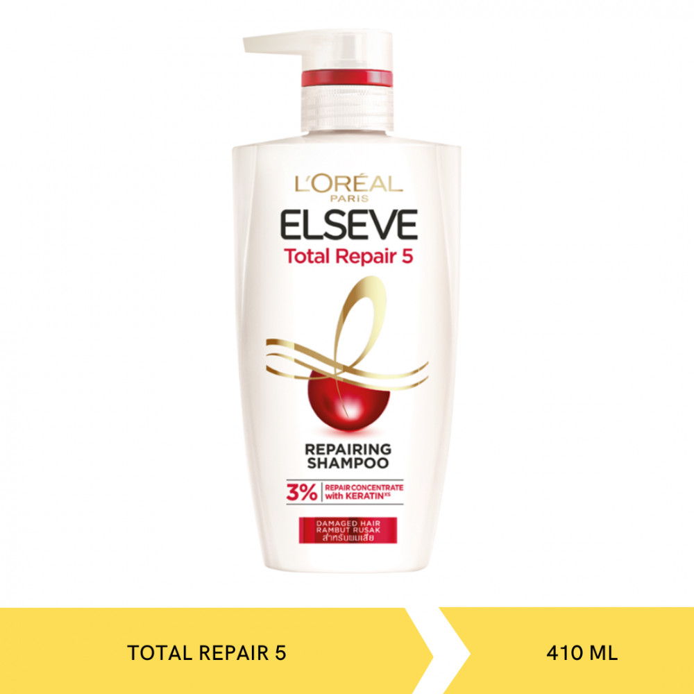 Total Repair 5 Shampoo dari L'Oreal Paris membantu melawan 5 tanda kerusakan rambut: rontok karena patah, kering, kusam, rapuh, dan bercabang . Mengandung Ceramide, replika bahan alami rambut yang akan membantu memperbaiki titik kerusakan pada rambut sekaligus merawat kekuatan batang rambut.
