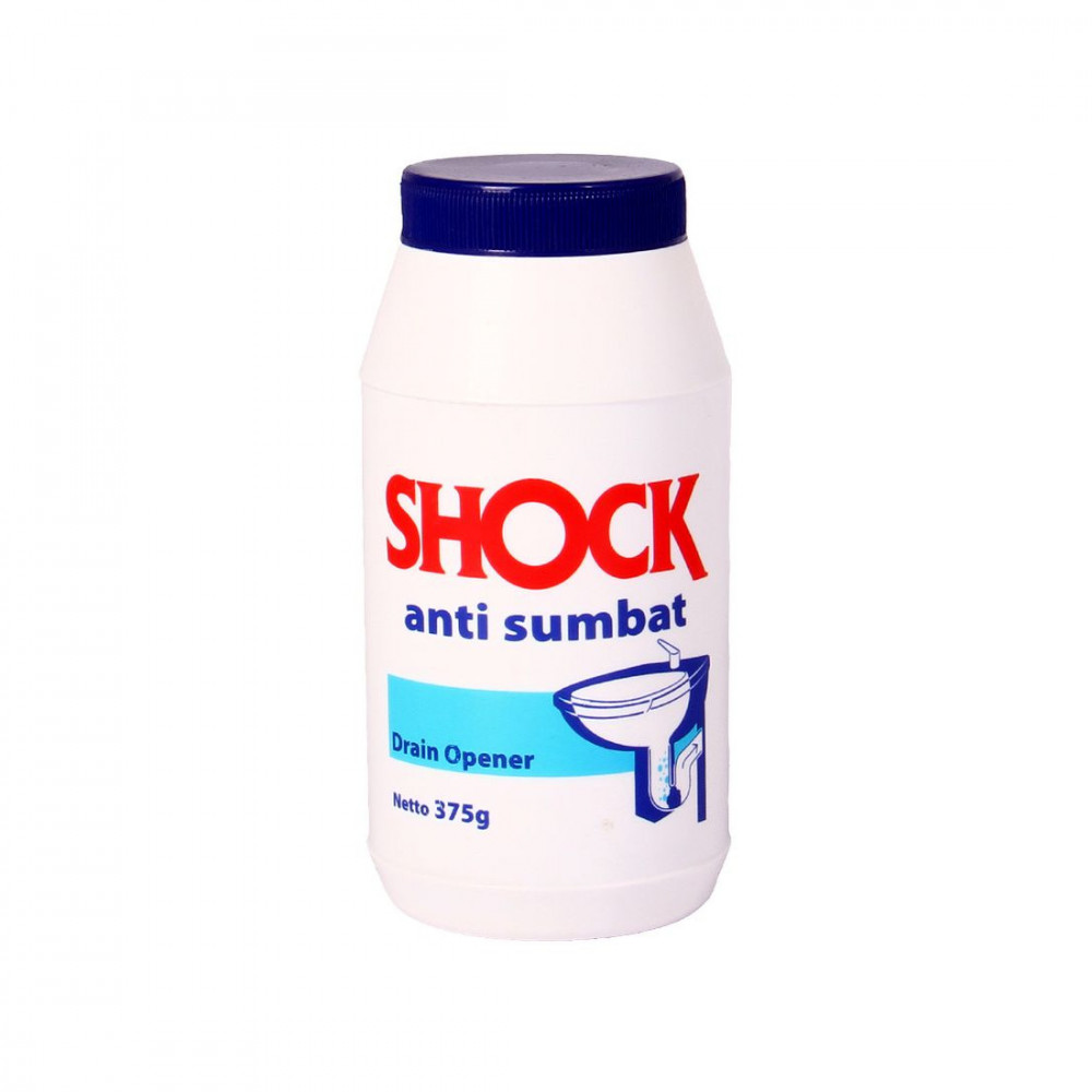 SHOCK Anti Sumbat 375g SHOCK Anti Sumbat berfungsi untuk menghancurkan rambut, benang, sisa makanan, dan lain-lain pada saluran wastafel atau saluran pipa lainnya. Aman untuk segala jenis pipa saluran dan septik tank. Hadir dengan kemasan botol 375g.