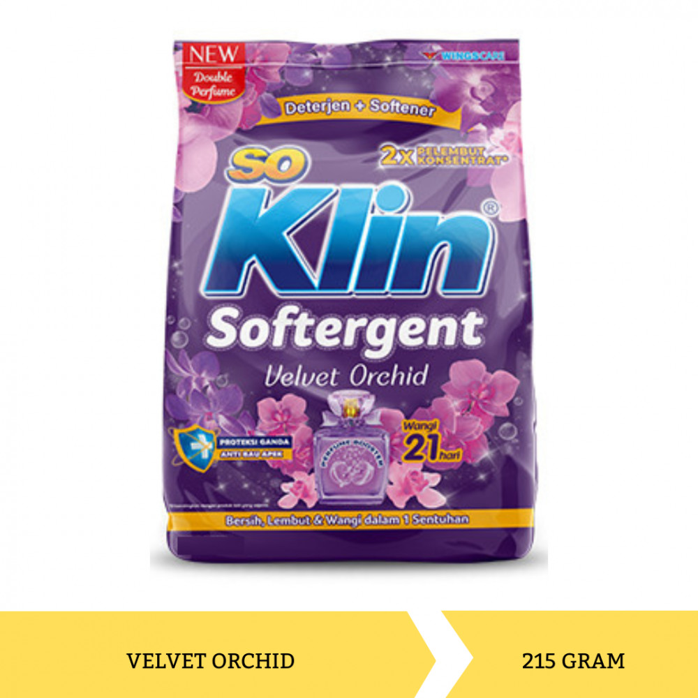 Rasakan kesegaran SOKLIN Deterjen Bubuk Velvet Orchid yang mampu menyegarkan pakaian keluarga dalam beraktivitas seharian. Pakaian menjadi bersih, lembut, dan wangi dalam satu sentuhan. So Klin Softergent merupakan solusi terbaik untuk mencuci secara ekonomis dan praktis. Pakaian menjadi bersih, 2x lebih lembut, & 2x lebih wangi.