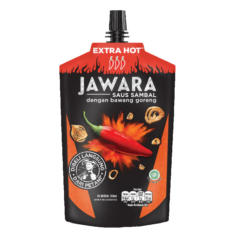 Jawara Saus Sambal Extra Hot yang terbuat dari cabai segar pilihan dan bawang goreng berkualitas tinggi kini hadir dalam kemasan 250ml yang lebih besar. Makin melimpah, makin nagih enaknya! Tersedia dalam kemasan pouch praktis yang mudah dibawa-bawa untuk bikin waktu makan kamu makin seru.