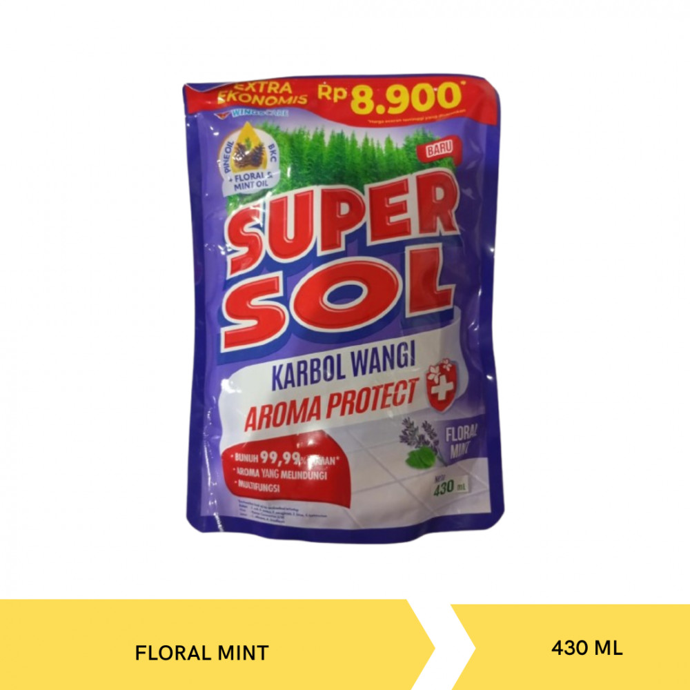 SUPERSOL Pembersih Lantai Karbol Floral Mint Efektif Bunuh Kuman 750ML, Diperkaya dengan Pine Oil, Floral & Mint Oil, serta BKC. Efektif BUNUH 99.9% Kuman, Bakter, Virus, Jamur